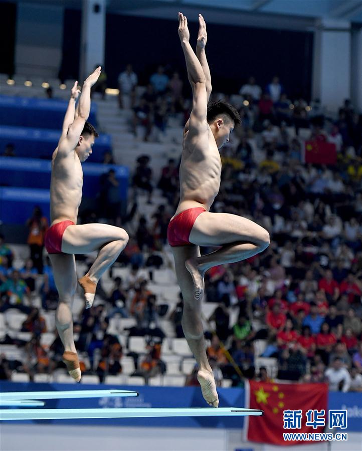 8月28日,中国选手曹缘/谢思埸(左)在比赛中。 当日,在第18届亚运会跳水男子双人3米跳板决赛中,中国选手曹缘/谢思埸以479.52分的成绩夺冠。 新华社记者岳月伟摄