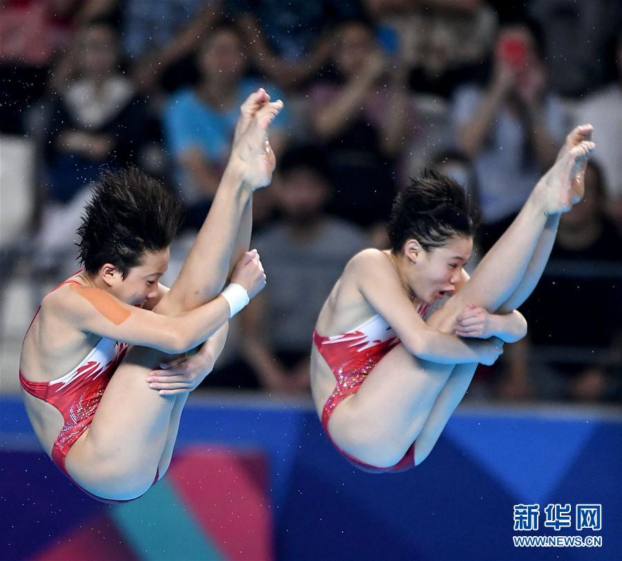 8月28日,中国选手张家齐/掌敏洁在比赛中。 当日,在第18届亚运会跳水女子双人10米跳台决赛中,中国选手张家齐/掌敏洁以361.38分的成绩夺冠。 新华社记者岳月伟摄