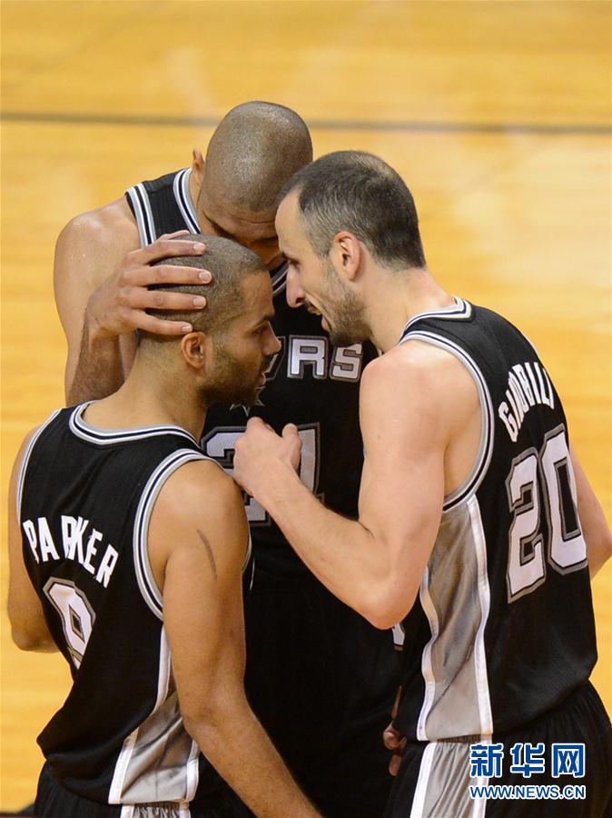 这是2013年6月6日,马刺队球员帕克(左)、邓肯(上)、吉诺比利(右)在2012/2013赛季NBA总决赛第一场比赛战胜迈阿密热火队后庆祝。 新华社记者王雷摄