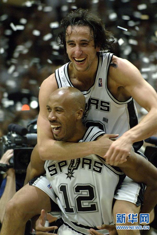 这是2005年6月23日,马刺队球员吉诺比利(上)和鲍文在获得赛季总冠军后庆祝胜利。 新华社记者戚恒摄