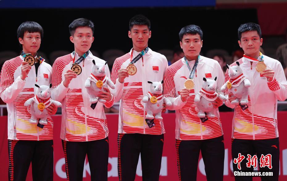 当地时间8月28日,雅加达亚运会乒乓球男团决赛中,国乒男队三位小将樊振东、林高远、王楚钦分别战胜各自对手,帮助球队3:0战胜韩国男乒,实现亚运会乒乓球男团七连冠。 中新社记者 刘关关 摄