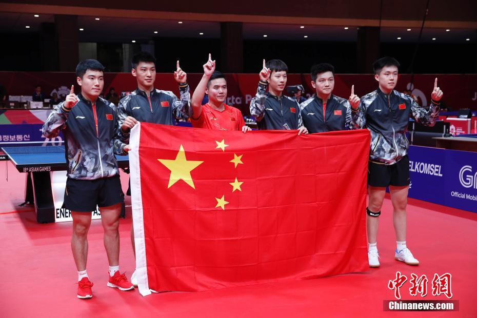 当地时间8月28日,雅加达亚运会乒乓球男团决赛中,国乒男队三位小将樊振东、林高远、王楚钦分别战胜各自对手,帮助球队3:0战胜韩国男乒,实现亚运会乒乓球男团七连冠。 中新社记者 刘关关 摄