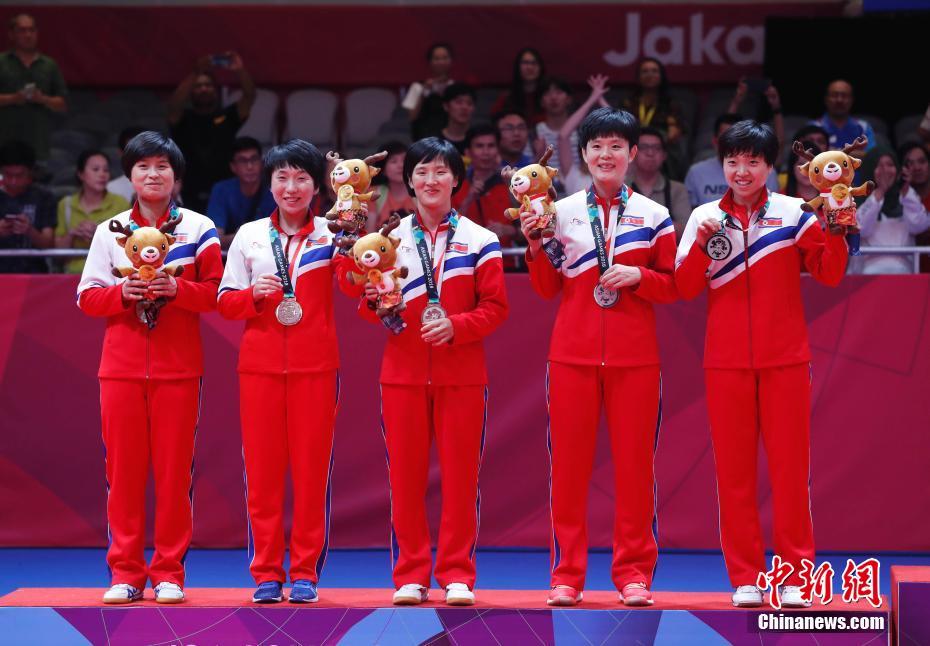 当地时间8月28日,雅加达亚运会乒乓球女团比赛中,朝鲜队获得亚军。 中新社记者 刘关关 摄