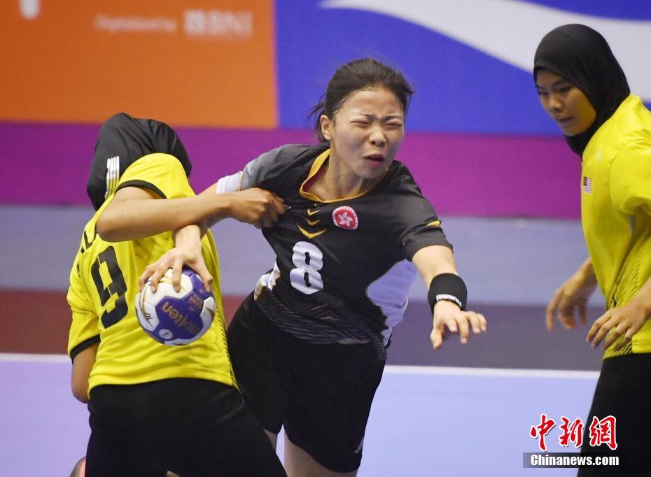 亚运会女子手球比赛,中国香港队(黑色球衣)迎战马来西亚队。马来西亚运动员为了阻止香港队的进攻,拽住对手的球衣。中新社记者 李霈韵 摄