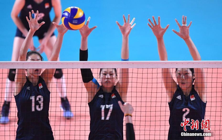 中国女排在亚运会小组赛最后一场与印度的比赛中,女排姑娘们三人拦网,印度选手伸出拇指。 中新社记者 李霈韵 摄