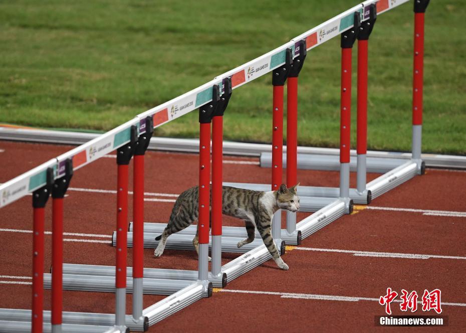 亚运会女子100米栏预赛鸣枪前,一只小猫跑上赛道,成为“编外选手”。中新社记者 侯宇 摄