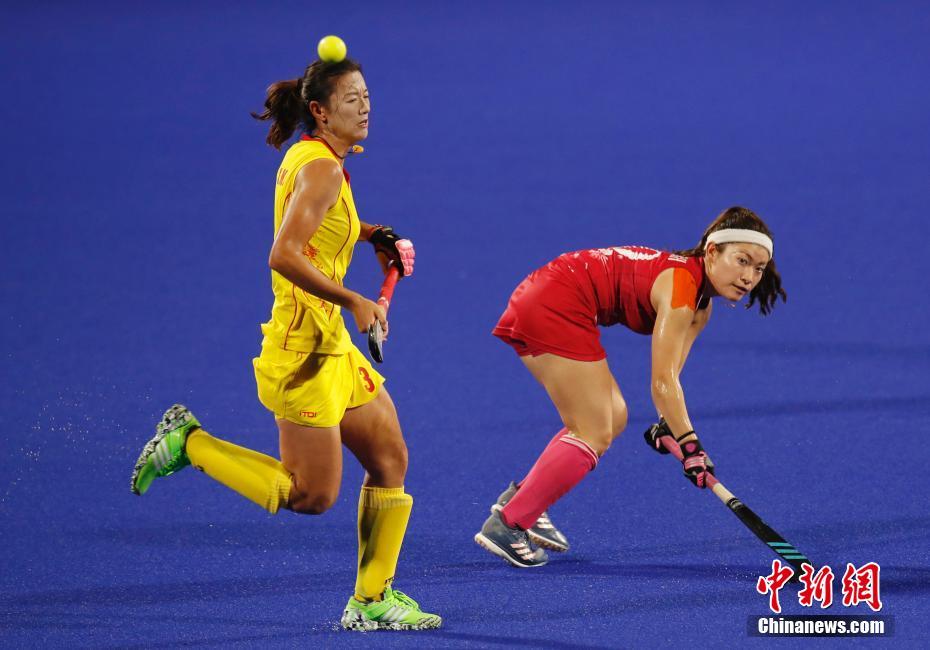 亚运会女子曲棍球小组赛中,中国队员(左)在比赛中拼抢。画面看起来就像头顶着小球一样。中新社记者 刘关关 摄