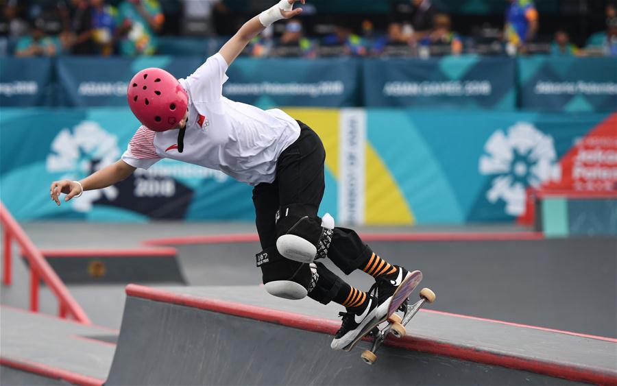 8月29日,中国选手张鑫在比赛中。 当日,在第18届亚运会滑板女子碗池决赛中,中国选手张鑫获得第三名。 新华社发(刘艾伦摄)