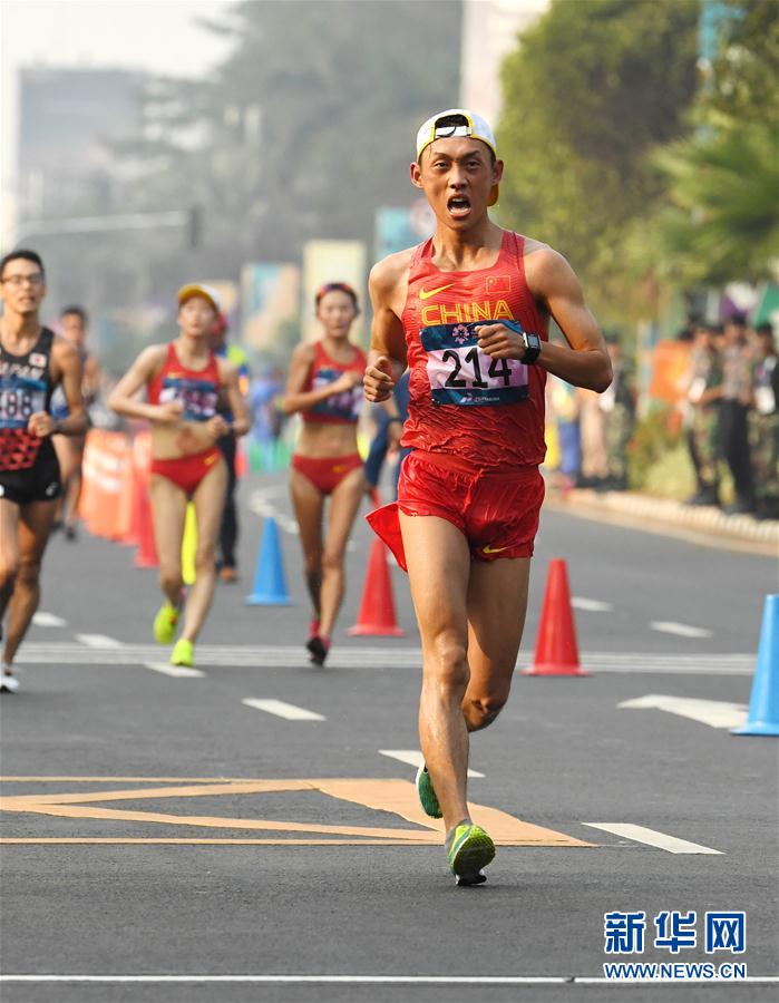 ↑8月29日,中国选手王凯华(前)在比赛中冲刺。 当日,在印度尼西亚雅加达举行的第18届亚运会田径男子20公里竞走比赛中,中国选手王凯华与金向前分获冠军和季军。 新华社记者李贺摄