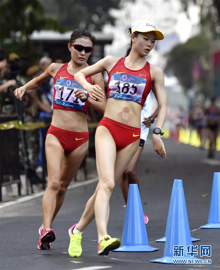 ↑8月29日,中国选手杨家玉(右)与中国选手切阳什姐在比赛中。 当日,在印度尼西亚雅加达举行的第18届亚运会田径女子20公里竞走比赛中,中国选手杨家玉与切阳什姐分获冠军和亚军。 新华社记者李贺摄
