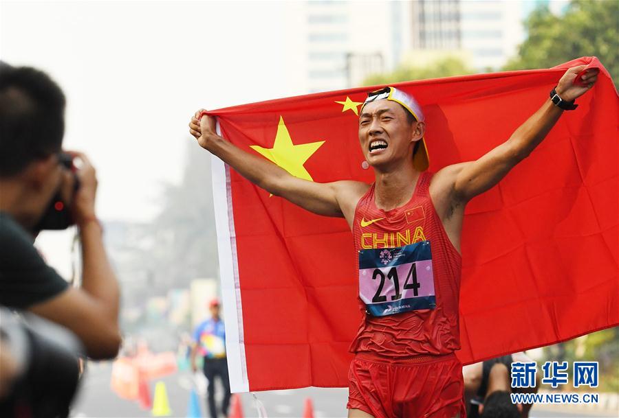 ↑8月29日,中国选手王凯华在赛后庆祝。 当日,在印度尼西亚雅加达举行的第18届亚运会田径男子20公里竞走比赛中,中国选手王凯华与金向前分获冠军和季军。 新华社记者李贺摄