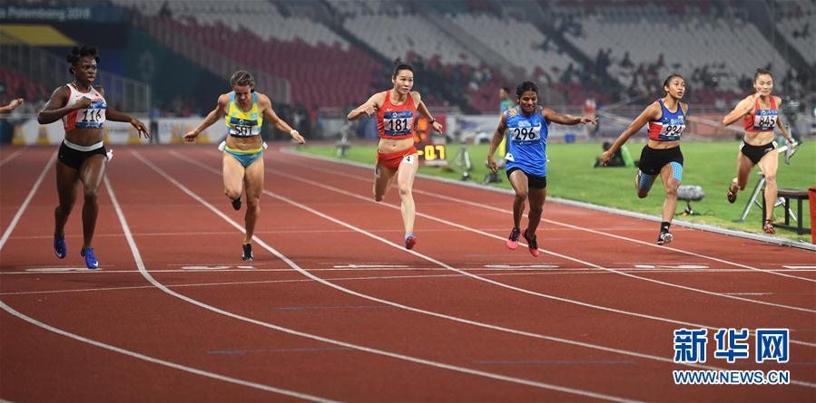 8月29日,中国选手韦永丽(左三)在比赛中。 当日,在第18届亚运会女子200米决赛中,中国选手韦永丽以23秒27的成绩获得季军。 新华社记者黄宗治摄