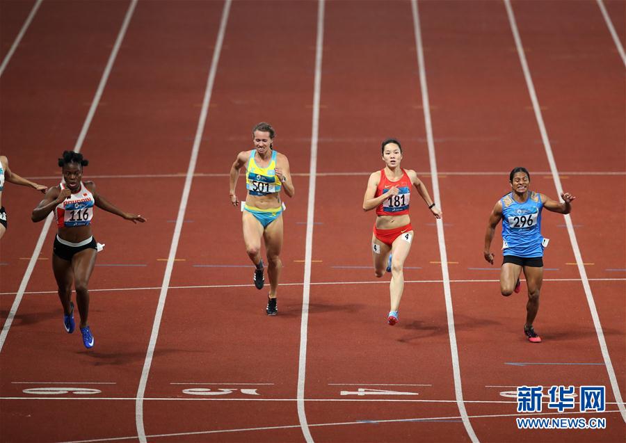 8月29日,中国选手韦永丽(右二)在比赛中。 当日,在第18届亚运会女子200米决赛中,中国选手韦永丽以23秒27的成绩获得季军。 新华社记者丁汀摄