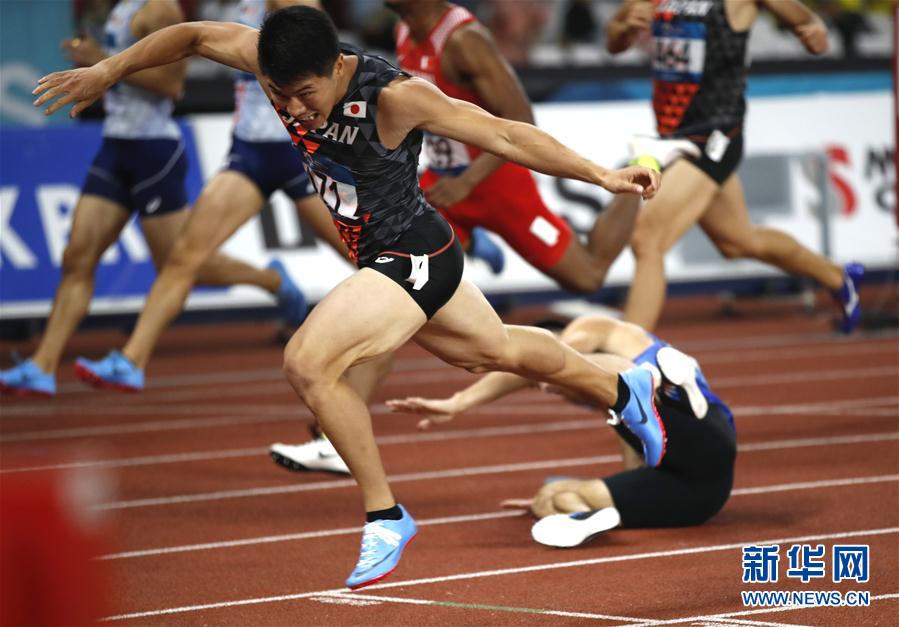 8月29日,日本选手小池佑贵(前)在比赛中。 当日,在第18届亚运会男子200米决赛中,日本选手小池佑贵以20秒23的成绩夺冠。 新华社记者王丽莉摄