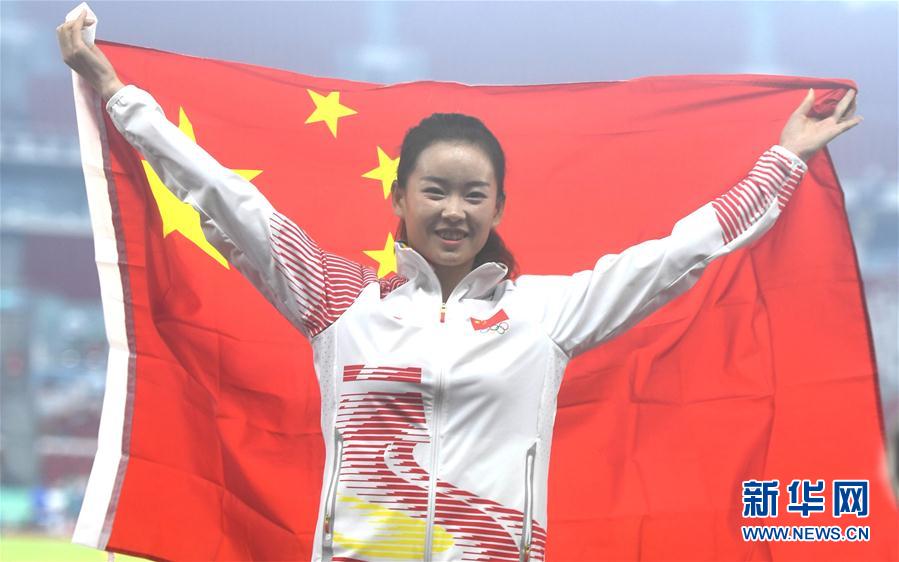 8月29日,冠军中国选手杨家玉在颁奖仪式上。 当日,第18届亚运会田径女子20公里竞走颁奖仪式在雅加达举行。 新华社记者黄宗治摄