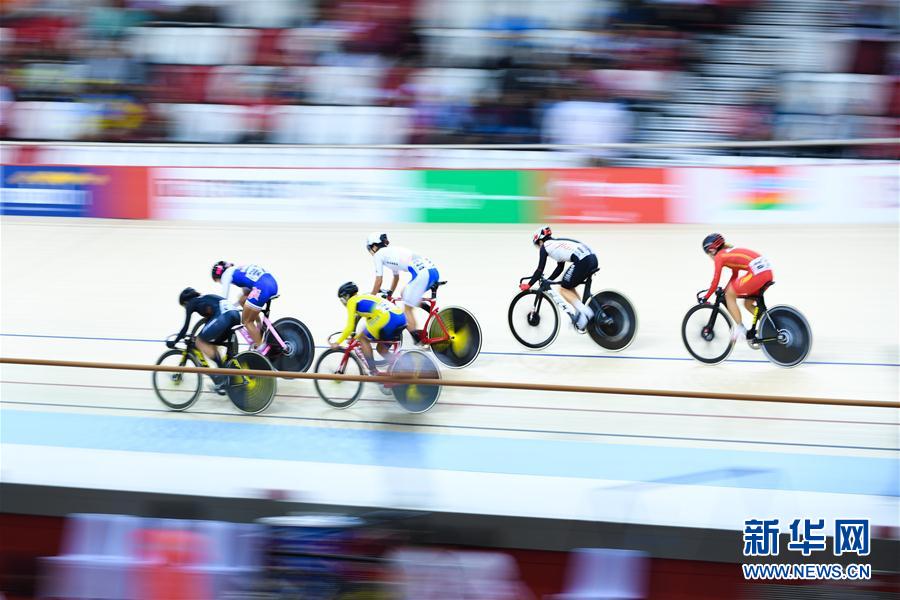 8月29日,选手在比赛中。 当日,第18届亚运会场地自行车女子全能赛决赛举行。 新华社记者杜宇摄