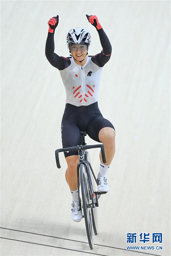 8月29日,日本选手梶原悠未在比赛后庆祝。 当日,第18届亚运会场地自行车女子全能赛决赛举行。 新华社记者杜宇摄