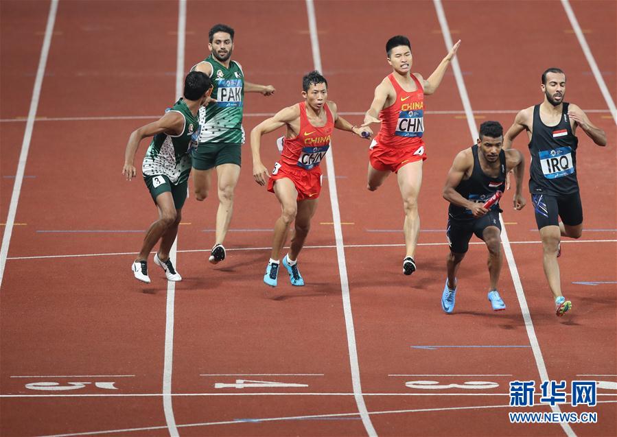 8月29日,中国队选手(中)在比赛中交接棒。 当日,第18届亚运会田径男子4X400米接力预赛在雅加达举行。 新华社记者丁汀摄
