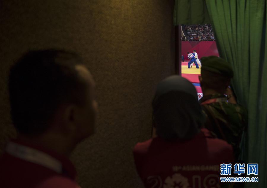 8月29日,工作人员挤在一个通道口观看第18届亚运会柔道比赛。 新华社记者费茂华摄