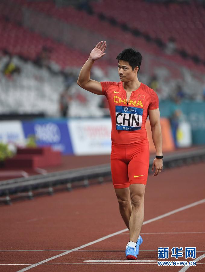 8月29日,中国队选手苏炳添在比赛后。 当日,在第18届亚运会田径男子4X100米预赛中,中国队以38秒88的成绩晋级决赛。 新华社记者黄宗治摄