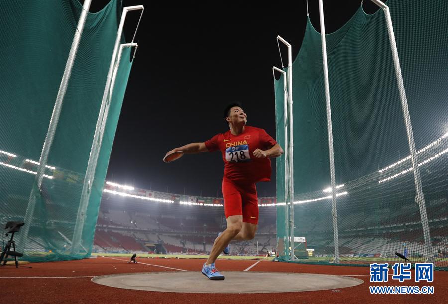 8月29日,中国选手吴健在比赛中。 当日,在第18届亚运会田径男子铁饼决赛中,中国选手吴健获得第八名。 新华社记者王丽莉摄