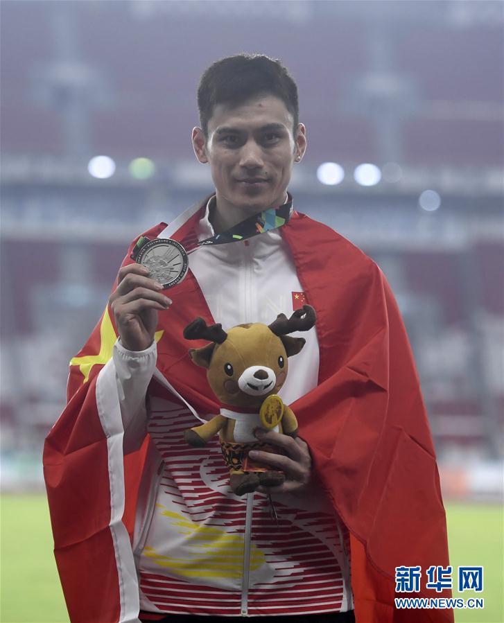 8月29日,亚军中国选手姚捷在颁奖仪式上。 当日,第18届亚运会男子撑杆跳高颁奖仪式在雅加达举行。 新华社记者黄宗治摄