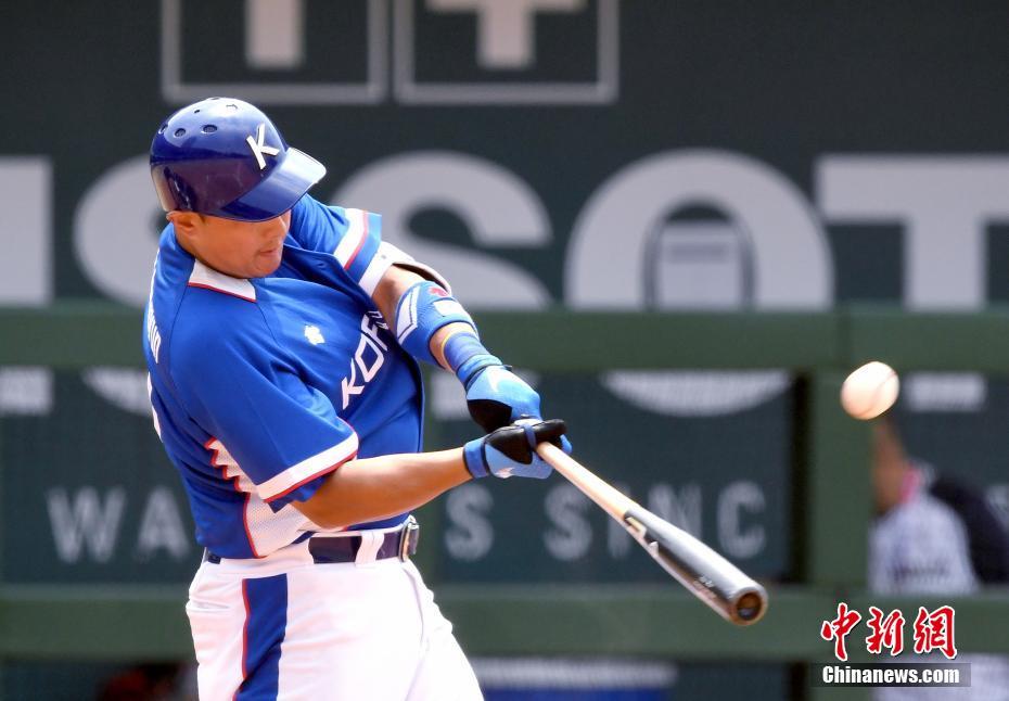 8月30日,雅加达亚运会男子棒球超级回合组比赛举行,亚洲两强日本队和韩国队展开比拼。图为韩国队内野手黄载润在比赛中击球。中新社记者 侯宇 摄
