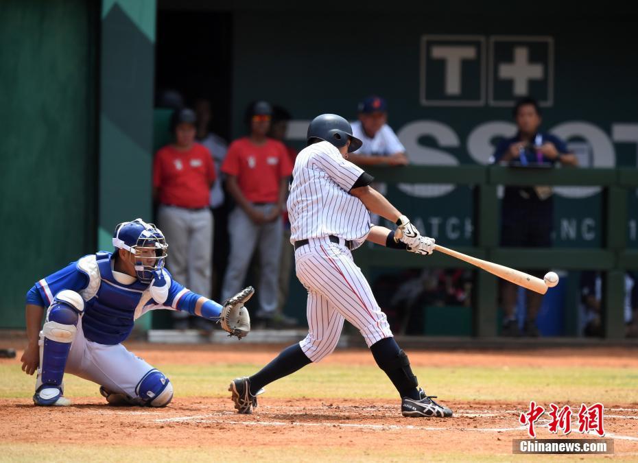 8月30日,雅加达亚运会男子棒球超级回合组比赛举行,亚洲两强日本队和韩国队展开比拼。图为日本队内野手喜纳淳弥挥棒击球。中新社记者 侯宇 摄