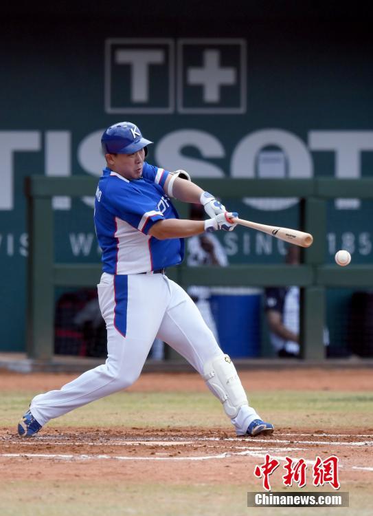 8月30日,雅加达亚运会男子棒球超级回合组比赛举行,亚洲两强日本队和韩国队展开比拼。图为韩国队内野手安致弘在比赛中挥棒击球。中新社记者 侯宇 摄
