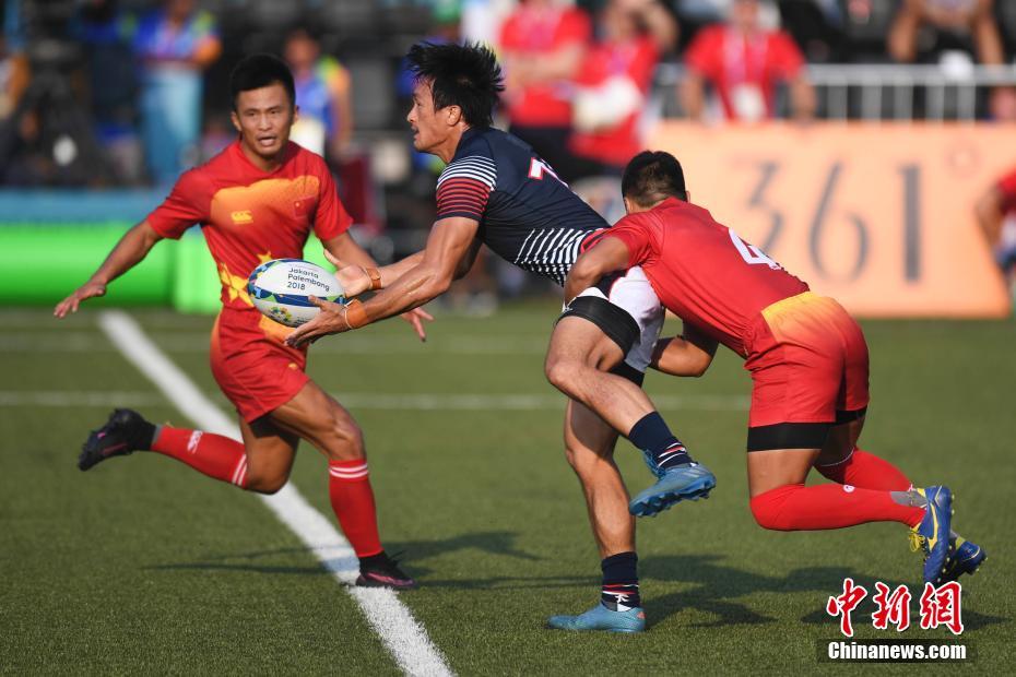 8月30日,雅加达亚运会男子橄榄球小组赛举行,中国香港队以42比17战胜中国队。图为中国队选手阻止中国香港队员的进攻。中新社记者 杨华峰 摄