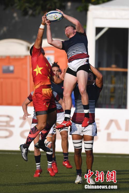 8月30日,雅加达亚运会男子橄榄球小组赛举行,中国香港队以42比17战胜中国队。图为双方队员争抢高空球。中新社记者 杨华峰 摄