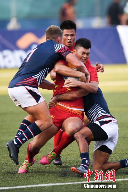 8月30日,雅加达亚运会男子橄榄球小组赛举行,中国香港队以42比17战胜中国队。图为中国队选手抱球突破。中新社记者 杨华峰 摄