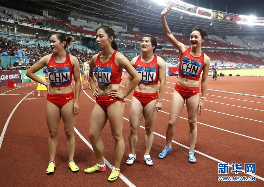 8月30日,中国队选手在比赛后。 当日,在第18届亚运会田径女子4X100米接力决赛中,巴林队以42秒73的成绩获得冠军。 新华社记者王丽莉摄