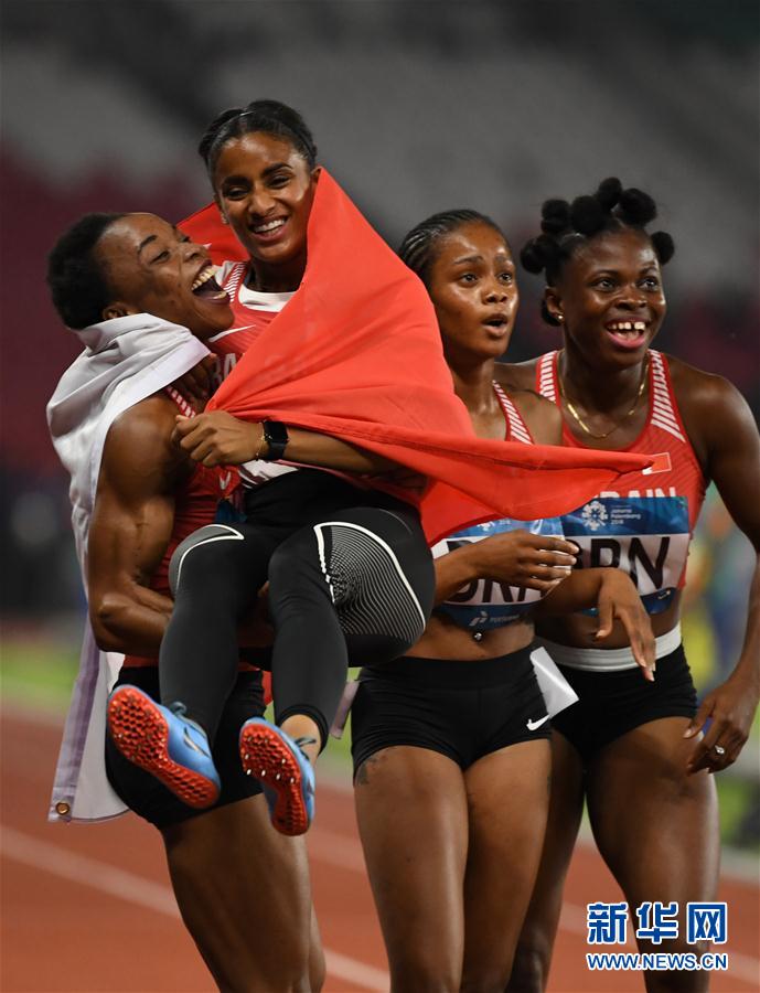 8月30日,巴林队选手在比赛后庆祝。 当日,在第18届亚运会田径女子4X100米接力决赛中,巴林队以42秒73的成绩获得冠军。 新华社记者李贺摄
