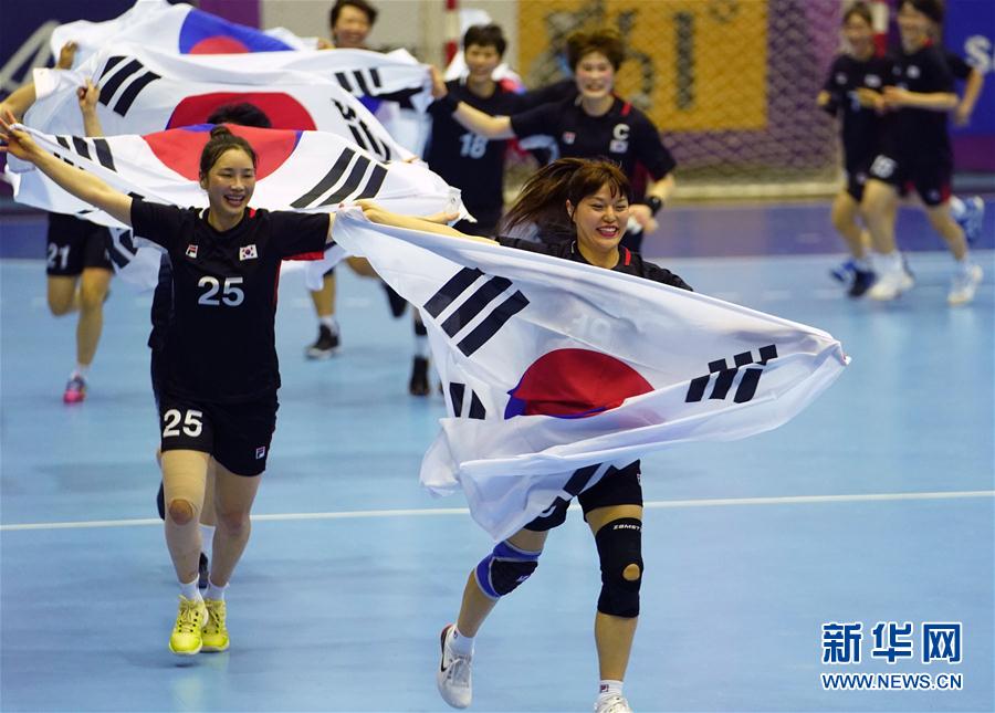 8月30日,韩国队球员在获胜后庆祝。 当日,在第18届亚运会女子手球决赛中,韩国队以29比23战胜中国队,获得冠军。 新华社记者王毓国摄