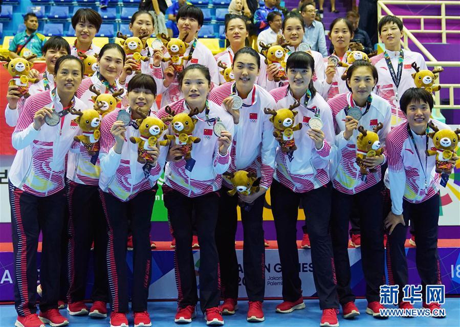 8月30日,亚军中国队在颁奖仪式后合影。 当日,第18届亚运会女子手球颁奖仪式在雅加达举行。 新华社记者王毓国摄