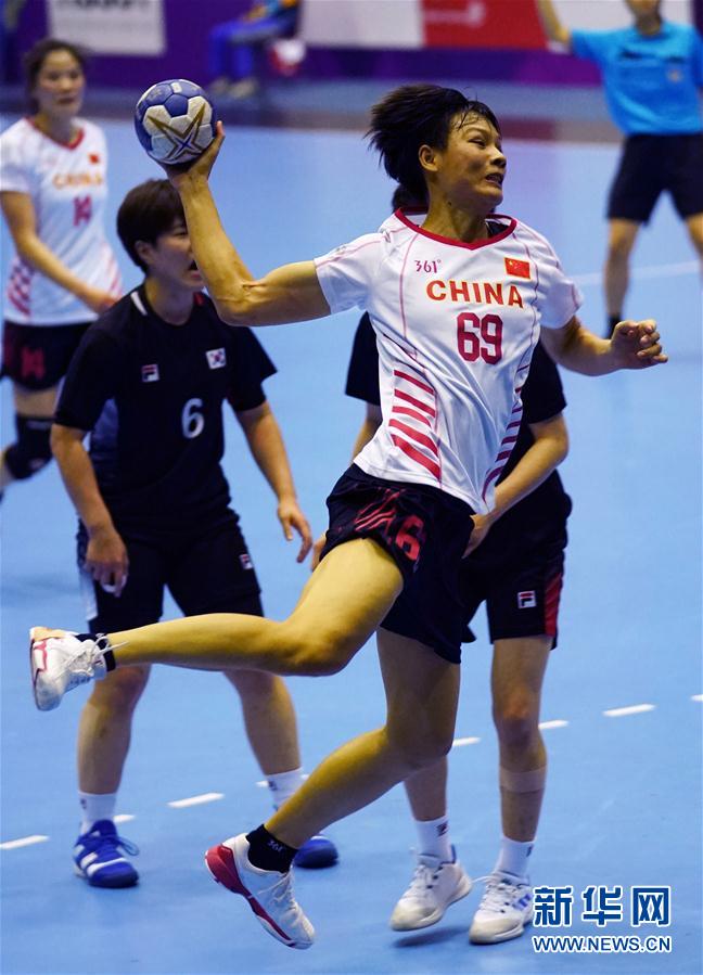 8月30日,中国队球员蓝小玲(右)在比赛中进攻。 当日,在第18届亚运会女子手球决赛中,中国队以23比29不敌韩国队,获得亚军。 新华社记者王毓国摄