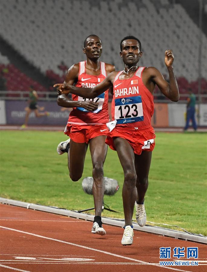 8月30日,巴林选手比尔哈努(右)在比赛中冲刺。 当日,在第18届亚运会田径男子5000米决赛中,巴林选手比尔哈努以13分43秒17的成绩获得冠军。 新华社记者李贺摄