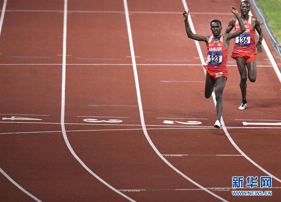 8月30日,巴林选手比尔哈努(左)在比赛中冲刺。 当日,在第18届亚运会田径男子5000米决赛中,巴林选手比尔哈努以13分43秒17的成绩获得冠军。 新华社记者黄宗治摄