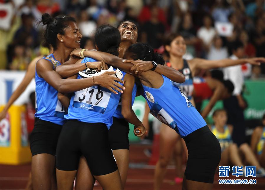 8月30日,印度接力选手在比赛后庆祝。 当日,在第18届亚运会田径女子4X400米决赛中,印度选手以3分28秒72的成绩获得冠军。 新华社记者王丽莉摄