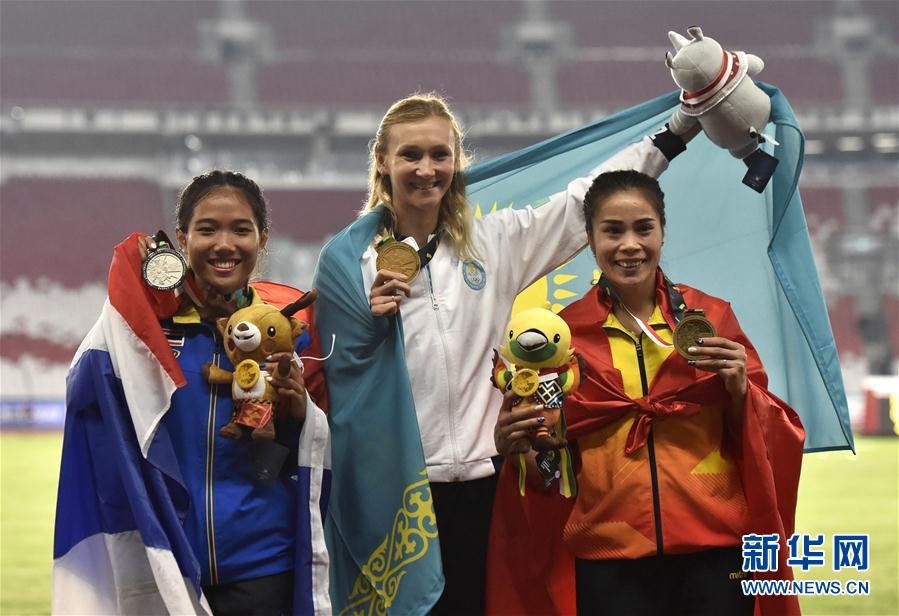 8月30日,冠军哈萨克斯坦选手雷帕科娃(中)在颁奖仪式上。 当日,在第18届亚运会田径女子三级跳远决赛中,哈萨克斯坦选手雷帕科娃以14米26的成绩获得冠军。 新华社记者李贺摄