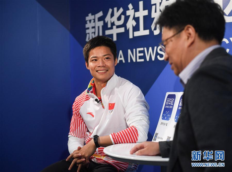 8月30日,苏炳添(左)接受新华社记者专访。 当日,第18届亚运会男子100米金牌获得者苏炳添在新华社雅加达亚运会发稿中心接受了专访。 新华社记者邬惠我摄