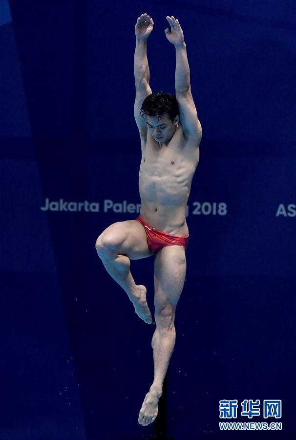 8月30日,中国选手彭健烽在比赛中。 当日,在第18届亚运会跳水男子1米跳板决赛中,中国选手彭健烽以462.15分的成绩获得冠军。 新华社记者岳月伟摄