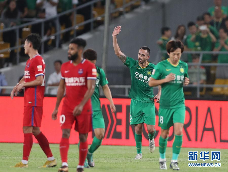 8月30日,北京国安队球员奥古斯托(右二)在比赛中庆祝进球。 当日,在2018赛季中超联赛第21轮比赛中,北京中赫国安队主场以2比1战胜重庆斯威队。 新华社记者曹灿摄