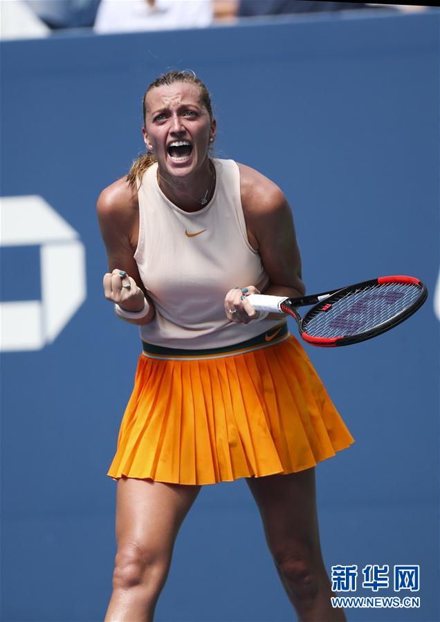 8月30日,科维托娃在比赛中庆祝得分。 新华社记者王迎摄