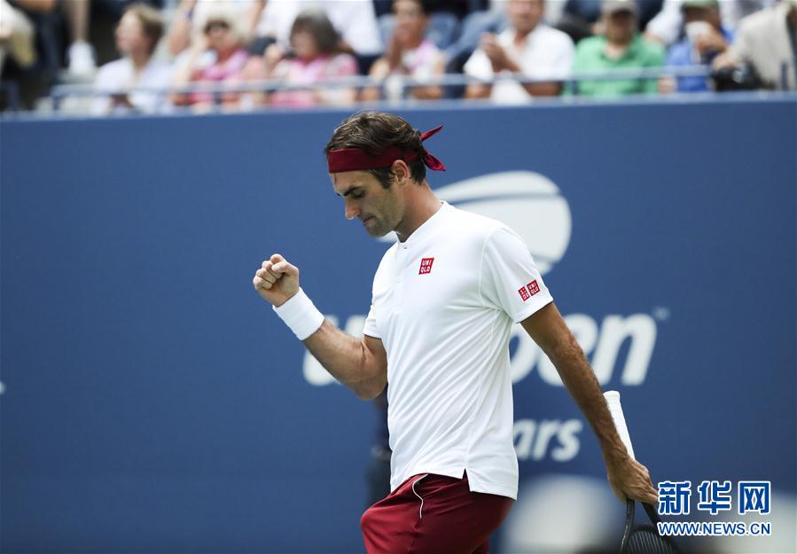 8月30日,费德勒在比赛中庆祝得分。 新华社记者王迎摄