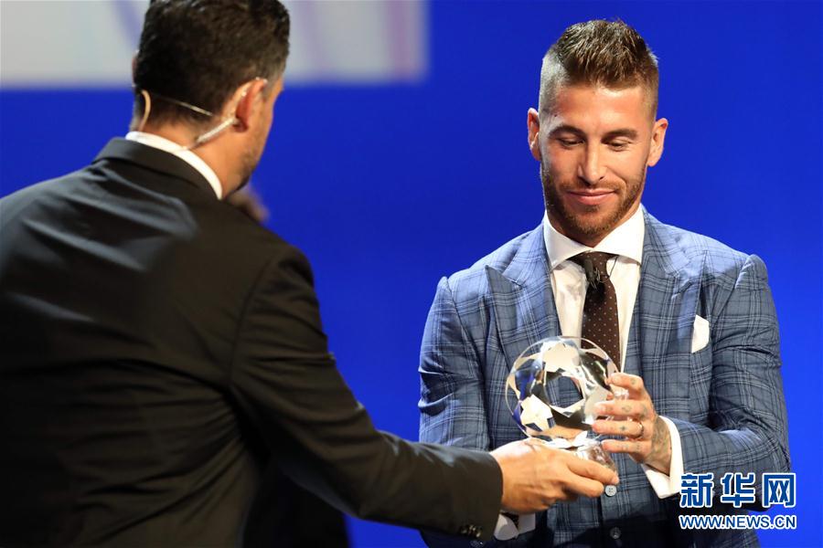 8月30日,西甲皇家马德里队球员拉莫斯(右)在颁奖仪式上接过最佳后卫奖奖杯。 新华社/法新