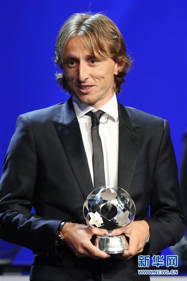 8月30日,效力于西甲皇家马德里队的克罗地亚球员莫德里奇手捧2017-2018赛季欧足联最佳中场奖杯在颁奖典礼现场发表获奖感言。 新华社/法新