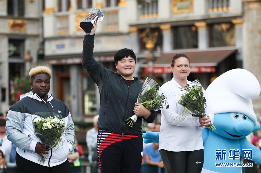 8月30日,巩立姣(中)在颁奖仪式上。 当日,在比利时布鲁塞尔市中心大广场举行的2018国际田联钻石联赛总决赛女子铅球比赛中,中国选手巩立姣以19米83的成绩夺得冠军。 新华社记者郑焕松摄