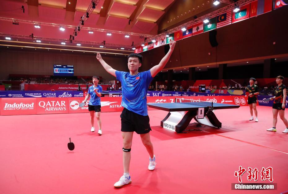 当地时间8月30日,在雅加达亚运会乒乓球混合双打决赛中,中国组合王楚钦/孙颖莎4比2击败队友林高远/王曼昱获得冠军。图为王楚钦/孙颖莎在比赛中。 中新社记者 刘关关 摄